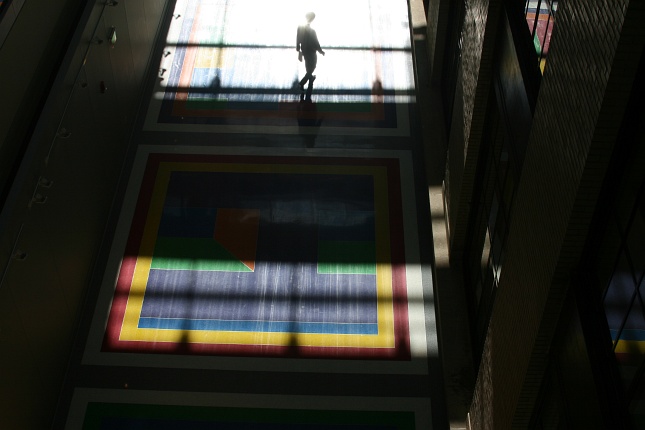 Back to building 6 at MIT, looking down on the floor with Sol Lewitt's Bars of Color within Squares. Cambridge, MA, USA. (2013/10)