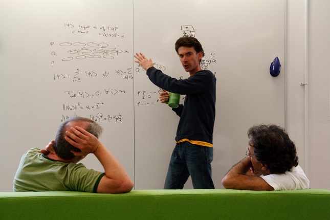 Thomas (speaking) with Zeph and Umesh. Simons Institute, Berkeley, CA. (2014/4)